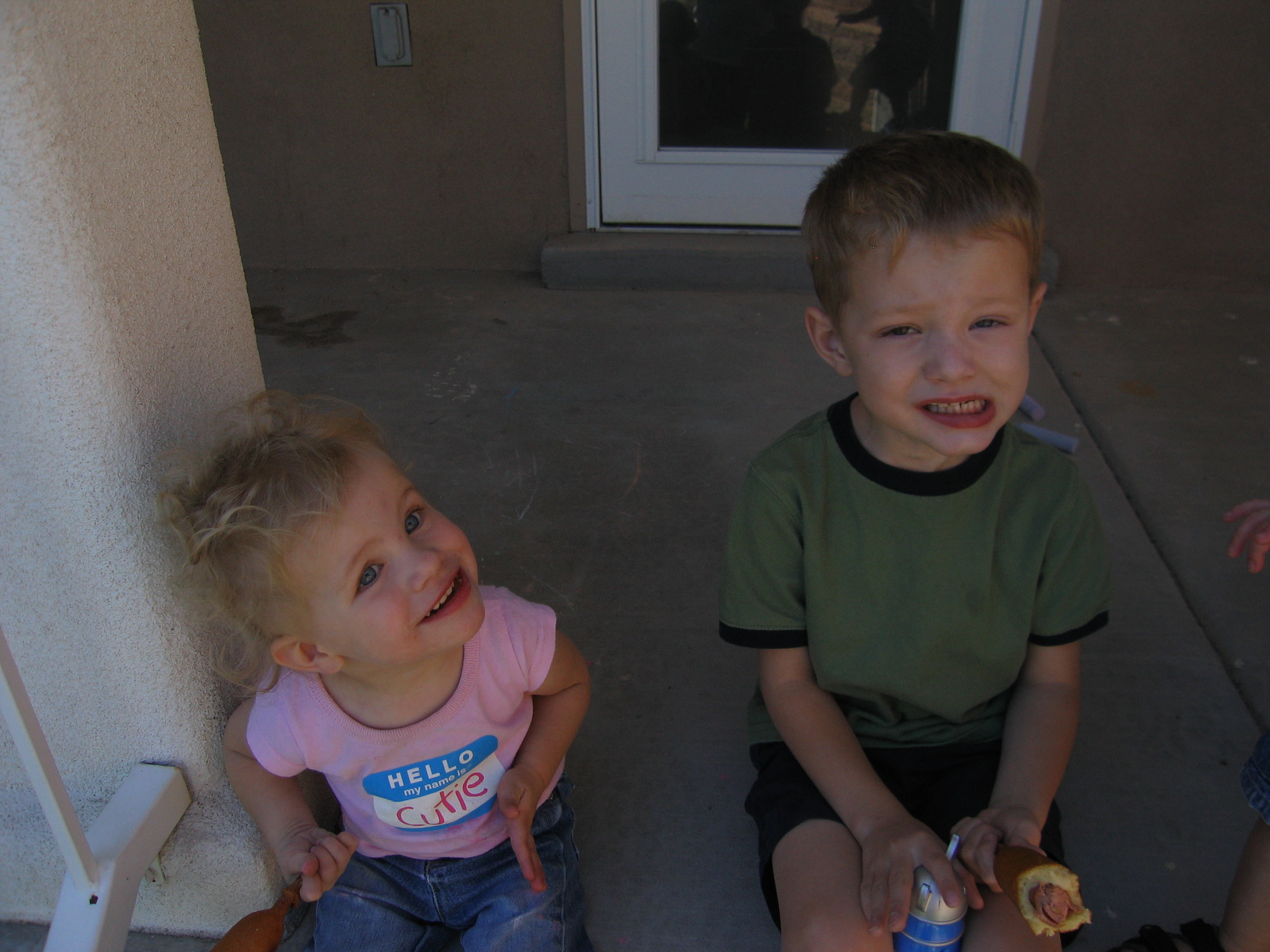 These pictures are from last month but I thought they were cute so I’m adding them now. Travis, Lucas and Emmy played outside and had some lunch! Emmy ate her first corndog! She even asks for them by name now! It sounds like this “IWANNACORNDOG”. Kind of like one long word! And being the tired pregnant mom that I am…I am always happy to oblige. They are a fast lunch fix…and if I add some fruit I feel like one of those health moms. Not to mention I choose Jif 🙂